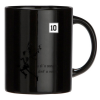 Microwavable and certified food-grade black ceramic mug packed in a box with a side window.